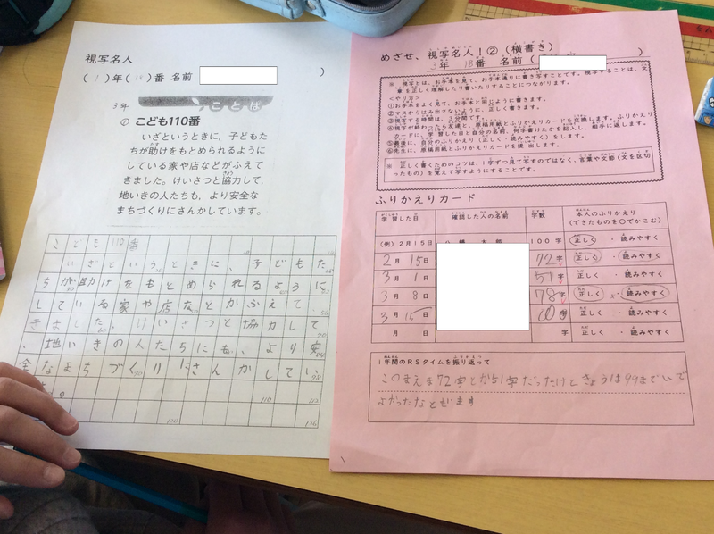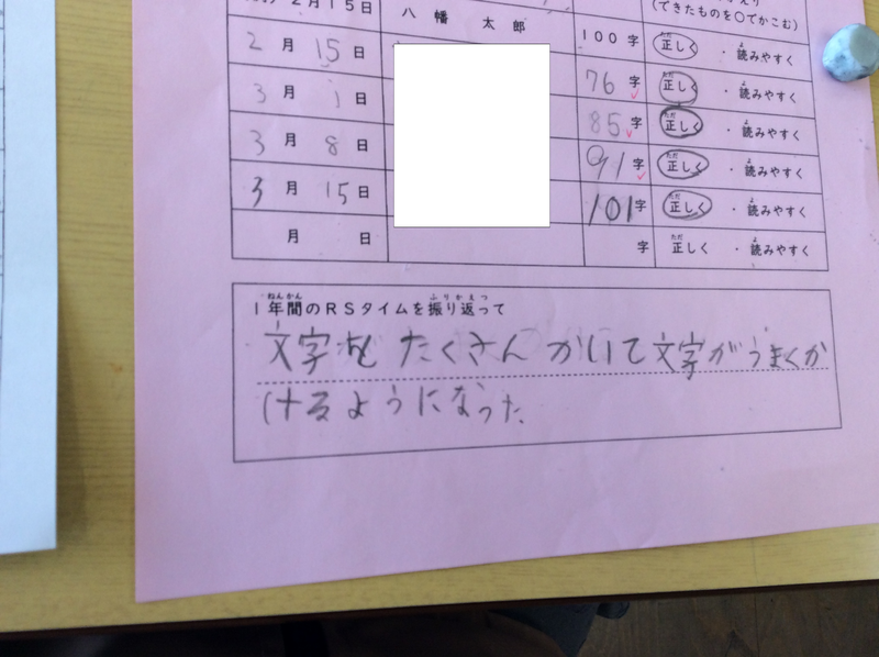 3月15日(水)の朝の時間、RSタイムを行いました。今年度最後のRSタイムとなります。横書きの視写に取り組んだあとは、1年間の振り返りをしました。