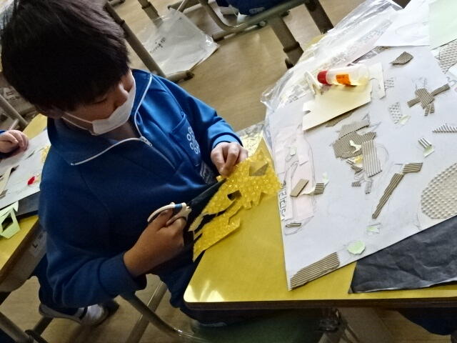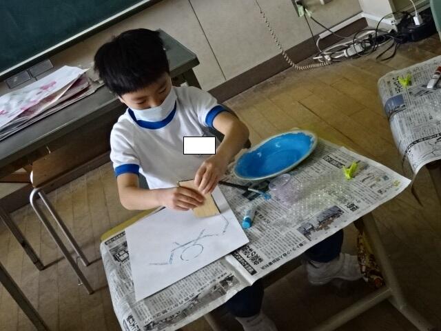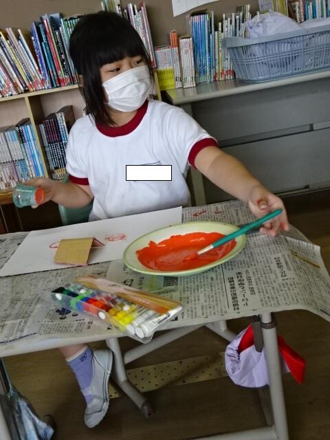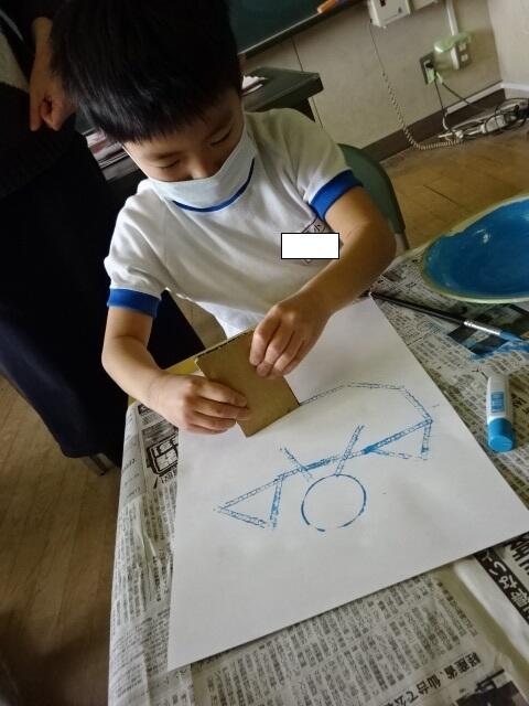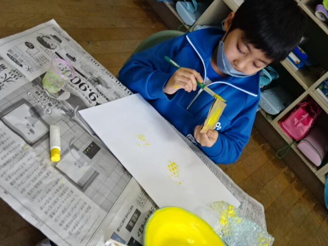いろいろな材料に絵の具で色をつけ、画用紙にもようをつけていきます。