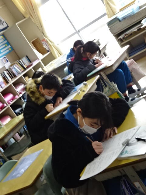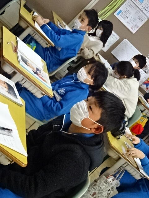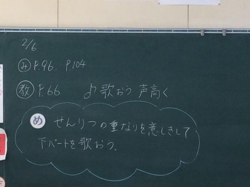 2月6日(月)の3年生の音楽の授業の様子です。「歌おう 声高く」という曲を歌いました。途中から二部に分かれます。今回は、下のパートを歌えるように練習しました。
