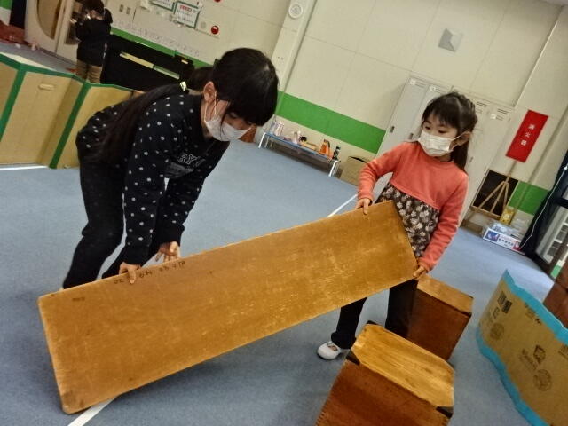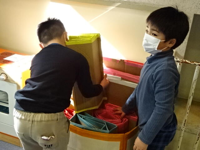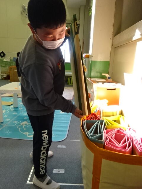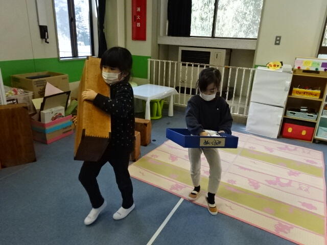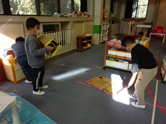 ホールでの遊びが終わると、みんなで協力して片付けをしました。