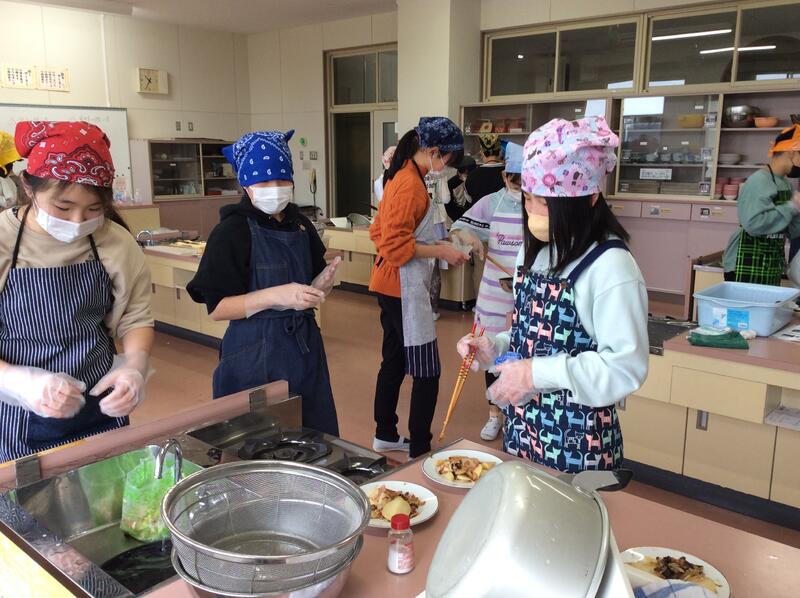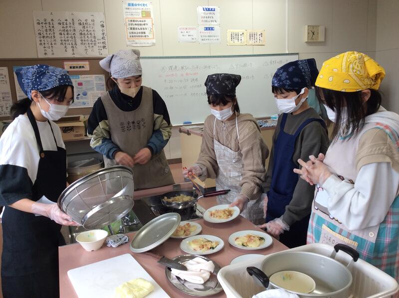 どの班も、友達と協力して、手際よく作っていました。家庭科室は、いい香りと和やかな空気に包まれていました。