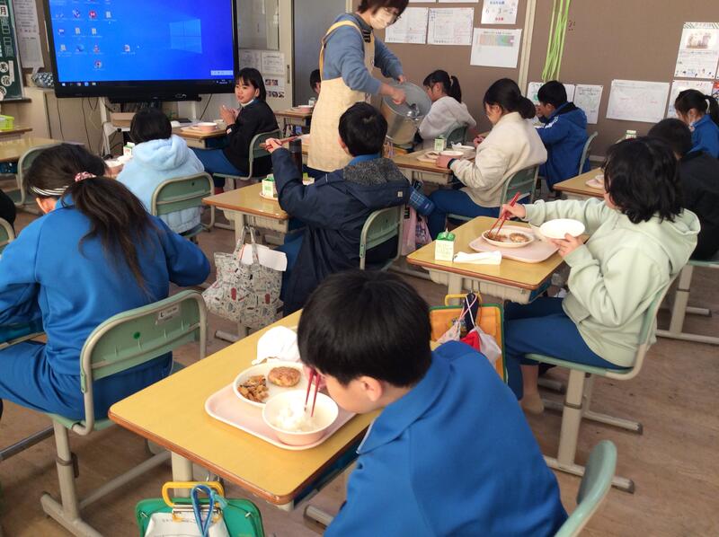 1月30日(月)の給食の様子です。1年生と2年生の教室の様子です。福島県の郷土料理であるこづゆとひきな炒りを,美味しそうに食べていました。