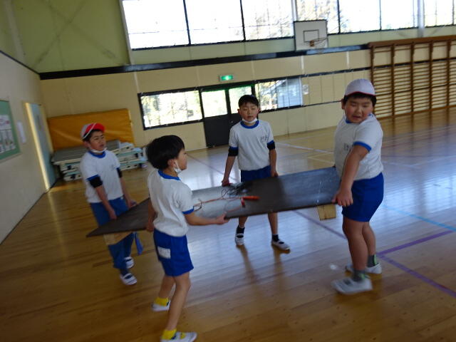 2年生が図画工作科で作った作品で友達と一緒に遊びました。