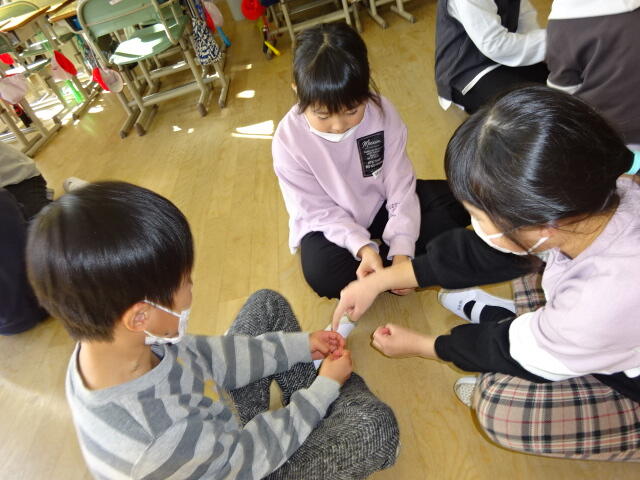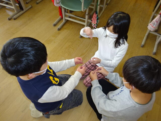 子どもたちは、3人組になって「ずいずいずっころばし」の手遊び歌を楽しみました。