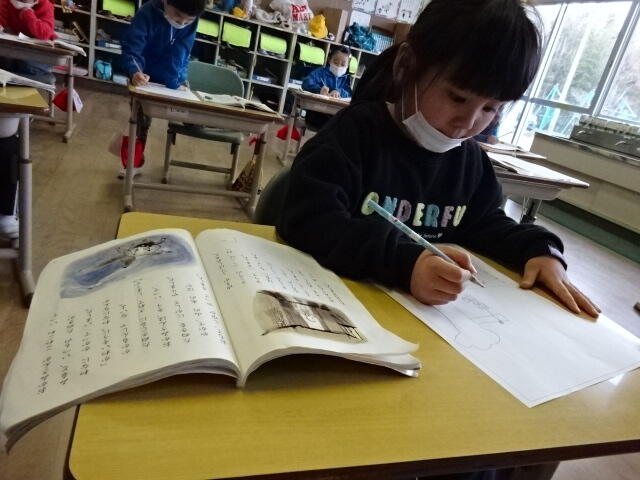 国語科の教材文「たぬきの糸車」の自分のお気に入りの場面を視写して、絵も上手に描けるようになりました。