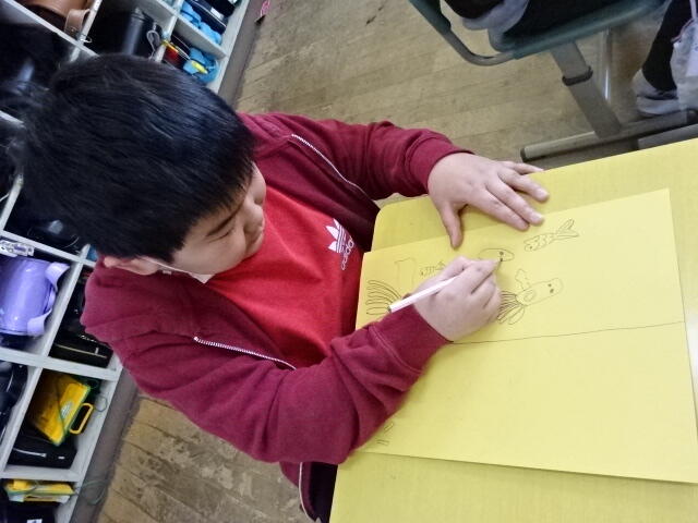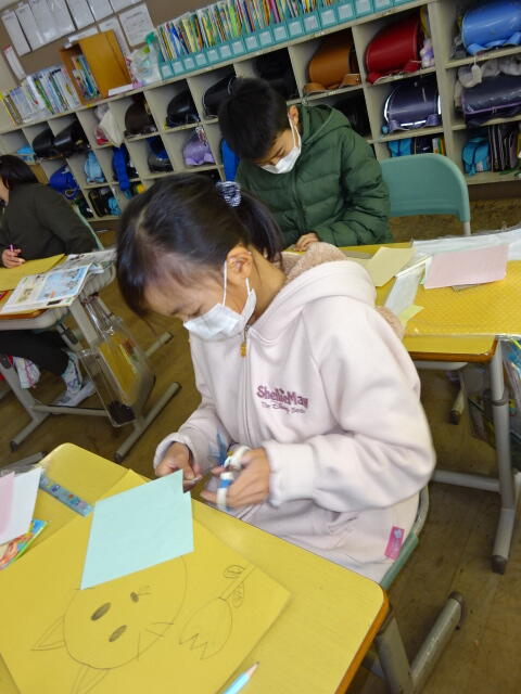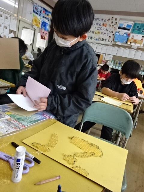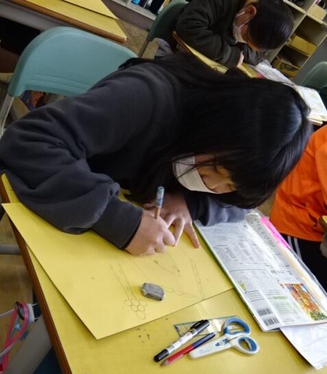 今日は、下絵をかき、表したいものに合った素材の紙を貼っていきます。