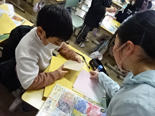 子どもたちは、作品の見本を参考にしながら作品づくりを進めました。