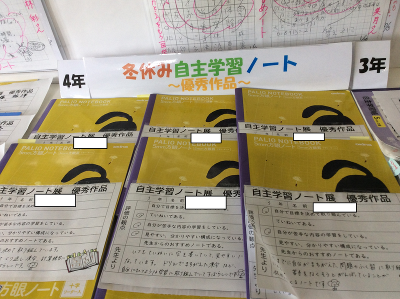 1月16日(月)から1月27日(金)まで、冬休み中に取り組んだ自主学習の優秀なノートを展示しています。場所は、1階の西階段前です。