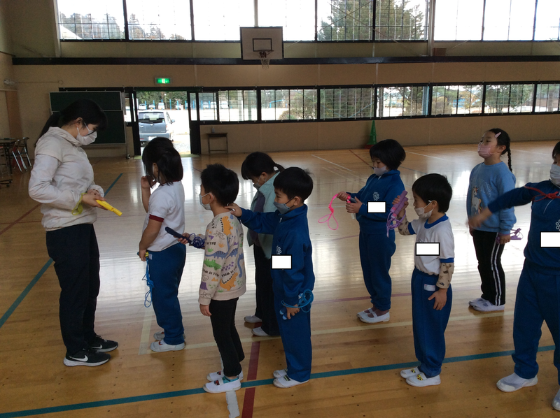 パワーアップタイムが終わって、1年生が整列する様子です。先生に習ったなわとびの持ち方も、自分でできるようになってきました。さすが1年生です。