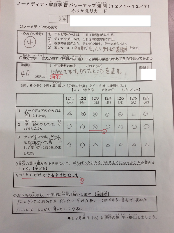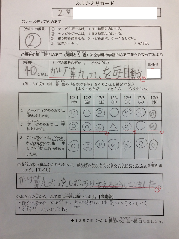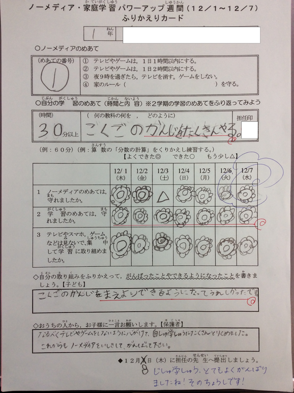 12月1日から7日までは、ノーメディア・家庭学習パワーアップ週間でした。テレビやゲームの時間を減らした分、自分に必要な学習は何かを考えて、自主学習に取り組みました。今回は、自分の学習のめあてを達成できたカードをいくつか紹介します。第一弾は、1~3年生のカードです。