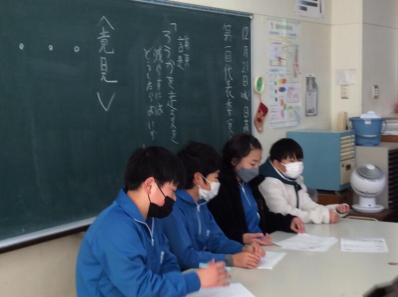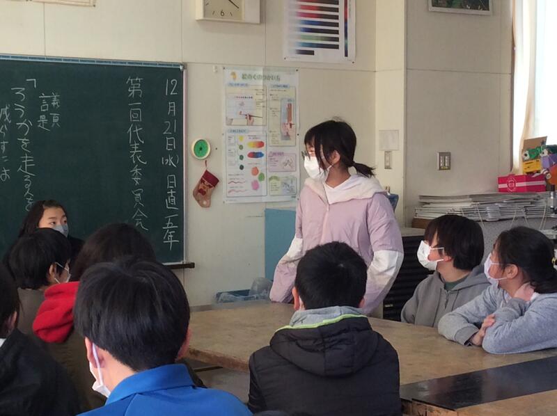 12月21日(水)の業間に、第1回代表委員会を開きました。議題は、「ろうかを走る人を減らすにはどうしたらよいか」です。この議題は、5年生と6年生が、それぞれ各学級で学校の問題点について考えて決まったものです。5年生が司会や書記を務めました。