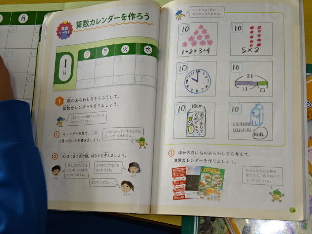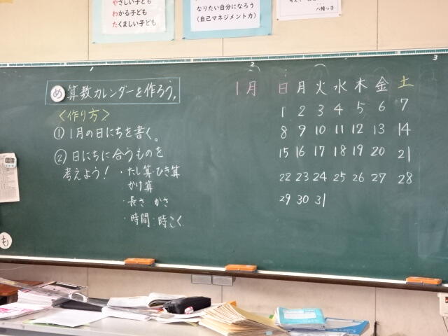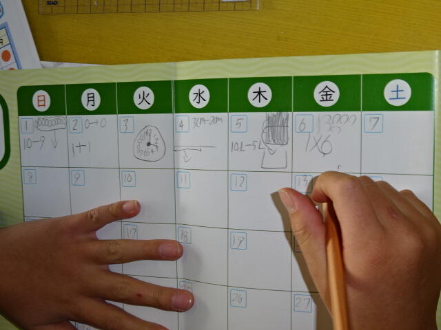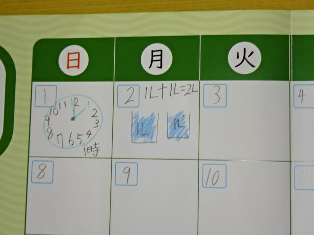 カレンダーの日にちに合うように、計算を考えたり、絵を考えたりします。