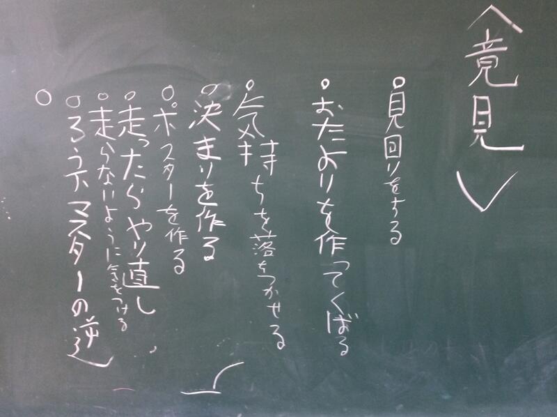 5年生全員と6年生の委員会のもと委員長が参加し、解決するための意見を出し合いました。上は、出された意見です。話し合いの結果、「ポスターやお便りなどでよびかける」ことに決まりました。決まったことを昼の放送で、5年生の代表が発表し、全校生に伝えました。自分たちの学校を自分たちでよくする取り組み、今後が楽しみです。