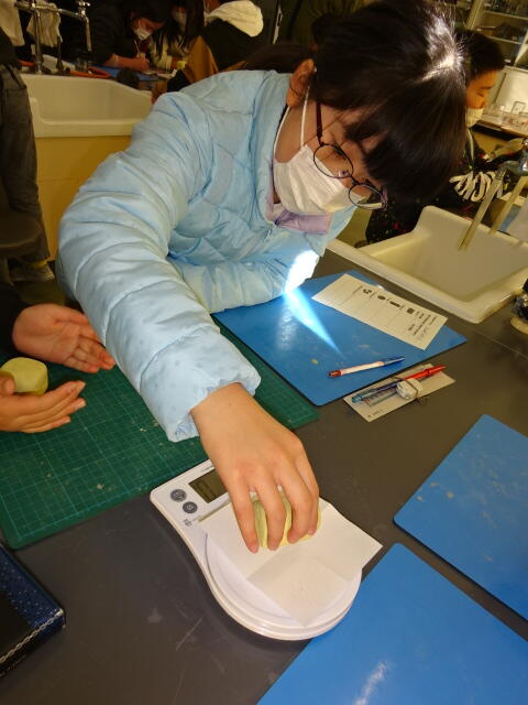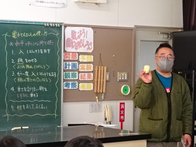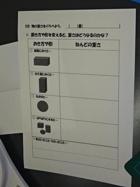 電子てんびんの使い方を確認した後、グループごとに調べてワークシートにまとめました。