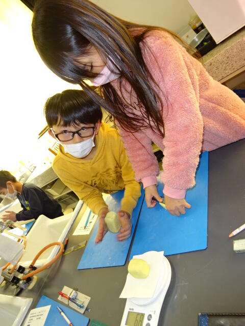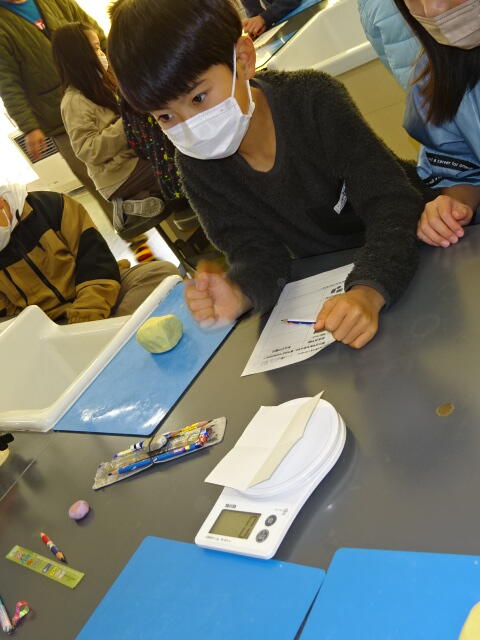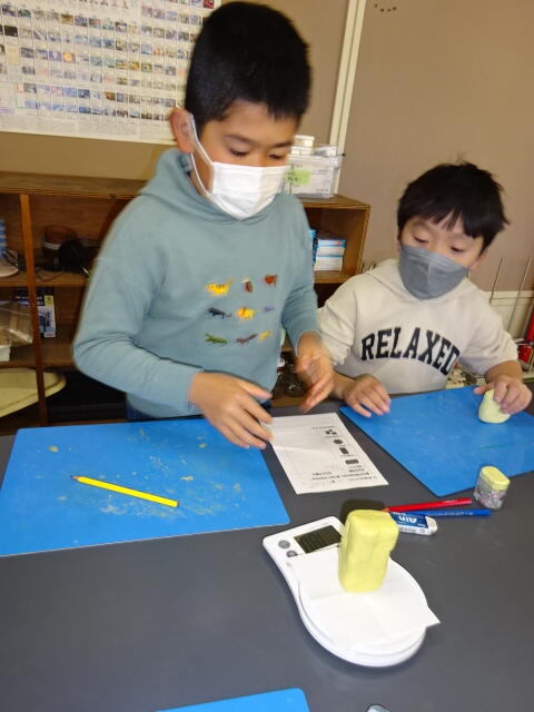 粘土の置き方や形を変えると重さはどうなるのかを調べます。