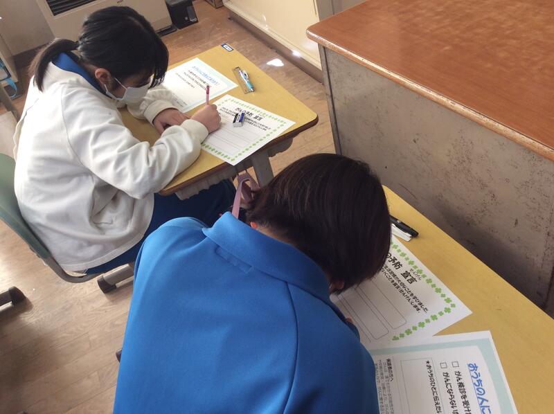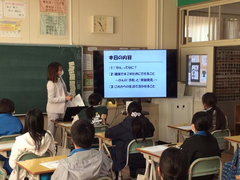 保健師の方をお招きして6年生にがん教室を実施してもらいました。「がんとは何か」「予防や早期発見のためにはどうすればよいのか」を学び、自分の生活を振り返る機会となりました。