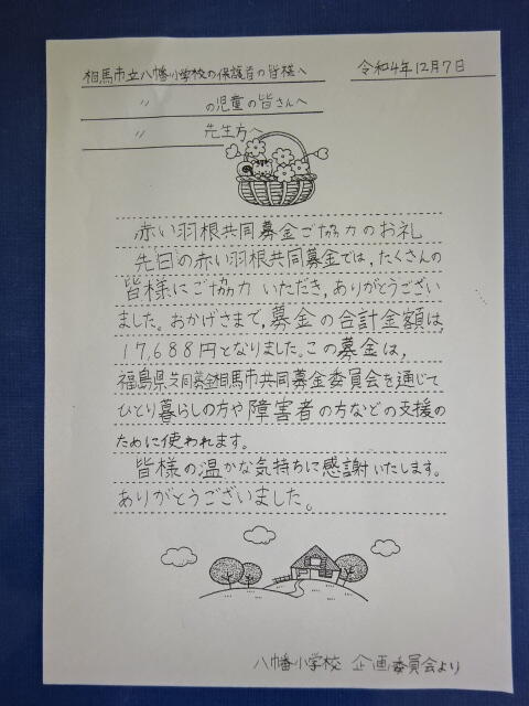 企画委員会の子どもたちが、赤い羽根共同募金の御礼の文書を作成してくれました。