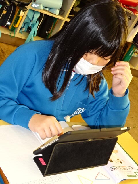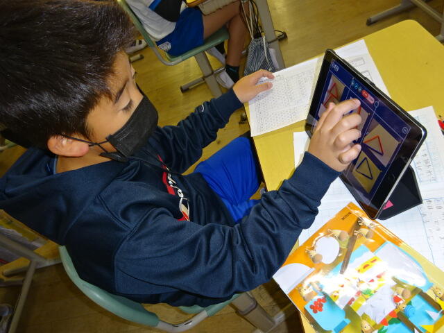 子どもたちは、タブレットを使って自分たちが作った三角形を3つのなかまに分け、どうしてそう分けたのかを説明しました。