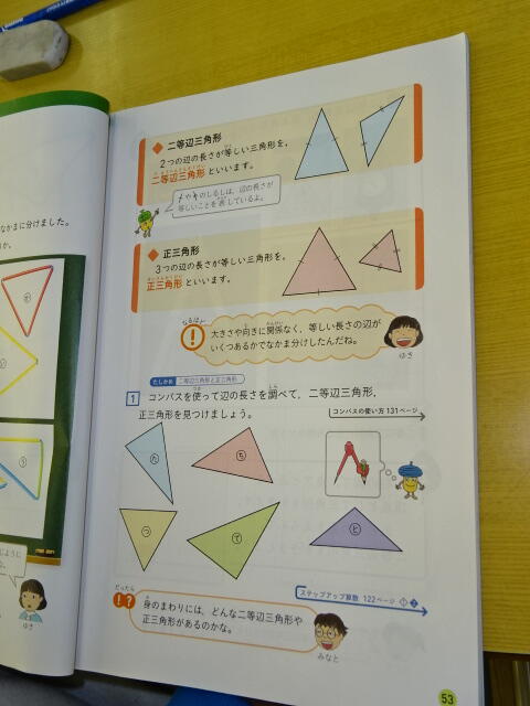 辺の長さの違いから仲間分けをした子どもたちは、教科書を見て二等辺三角形と正三角形という新しい言葉を学習しました。