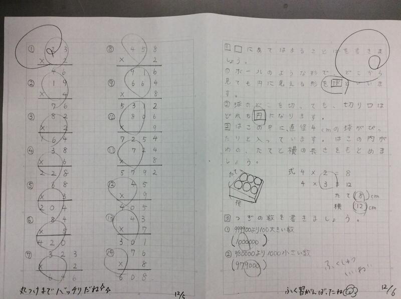 今回は、3年生と4年生の自主学習ノートの紹介をします。下は、3年生のノートです。かけ算の筆算と円の大きさ、大きい数と、算数の復習に力を入れて取り組んでいるのがわかります。