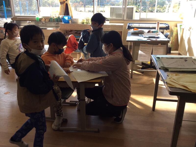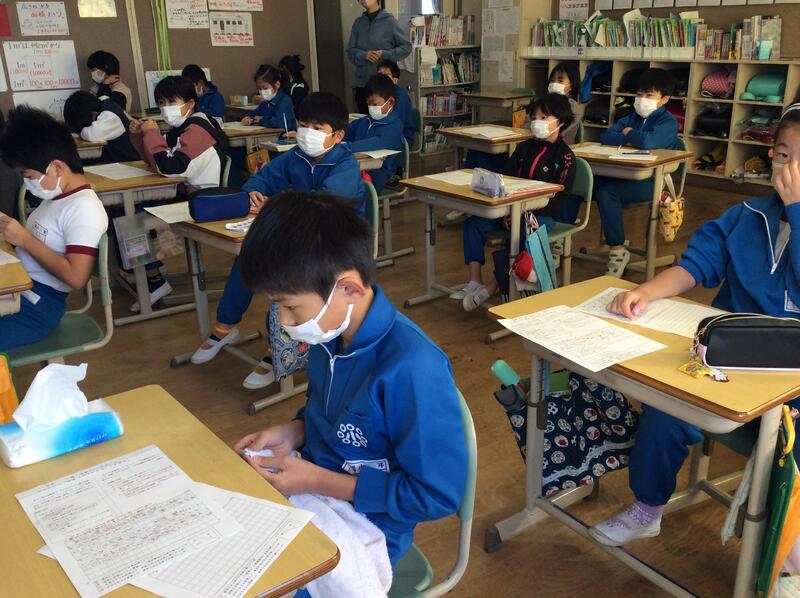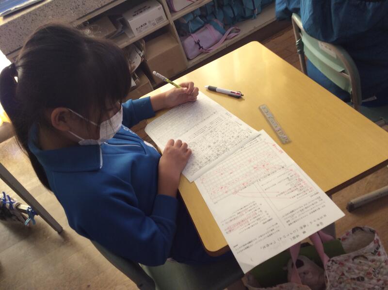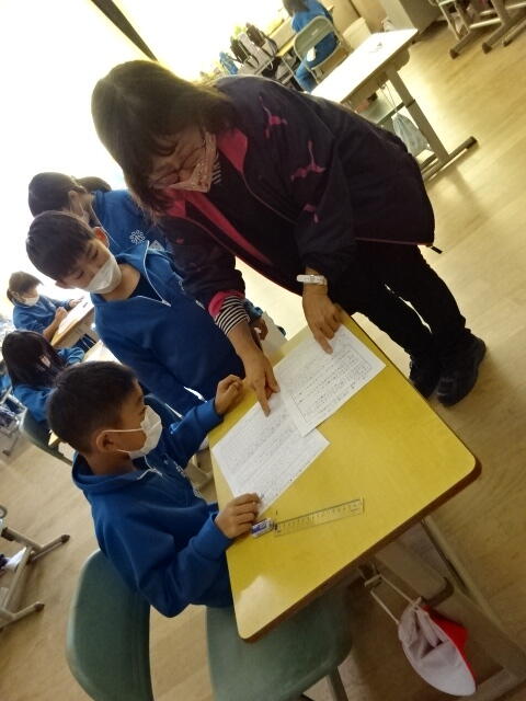 10月27日(木)のRSタイムの様子です。今回は、条件付き作文の2回目でした。担任の先生から、採点された作文用紙が返されました。子どもたちは、解答例を参考にして、間違いを直しました。こちらは、1年生と4年生のRSタイムの様子です。1年生は、先生にやり方を聞きながら直しました。