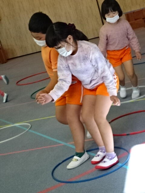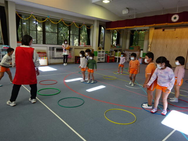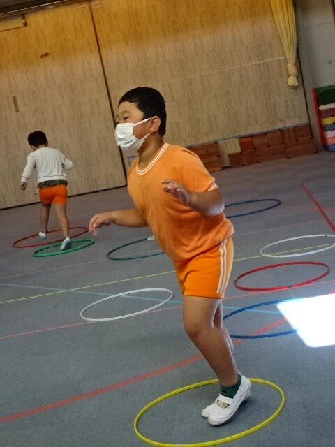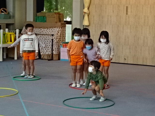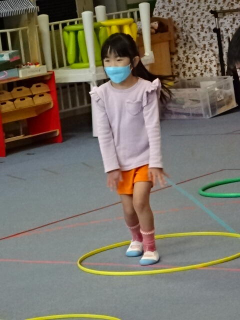 「だるまさんがころんだ」と唱えた後に、フラフープの中に入っていればセーフです。