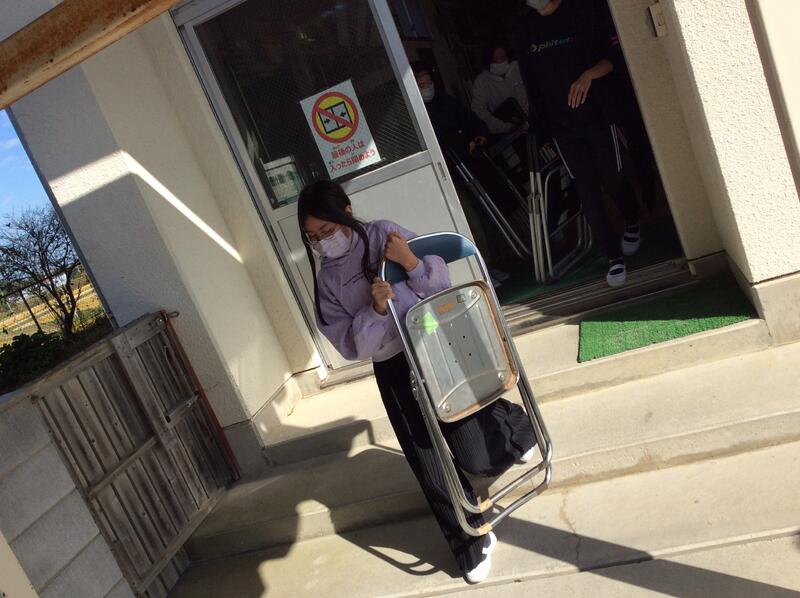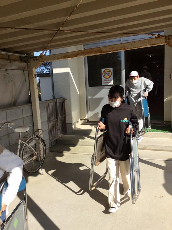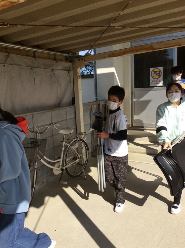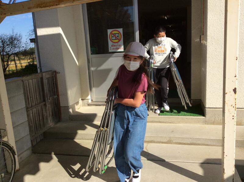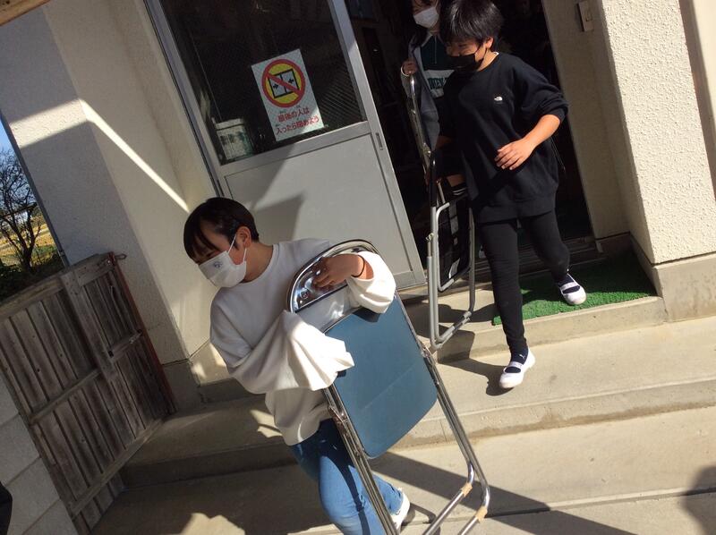 10月28日(金)の昼休みに、5年生と6年生が、パイプイスを体育館に運ぶ仕事をしました。明日10月29日(土)の学習発表会で、保護者の方々が座るイスの準備です。