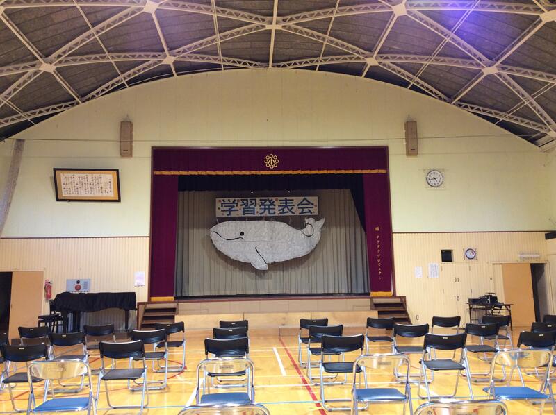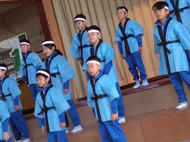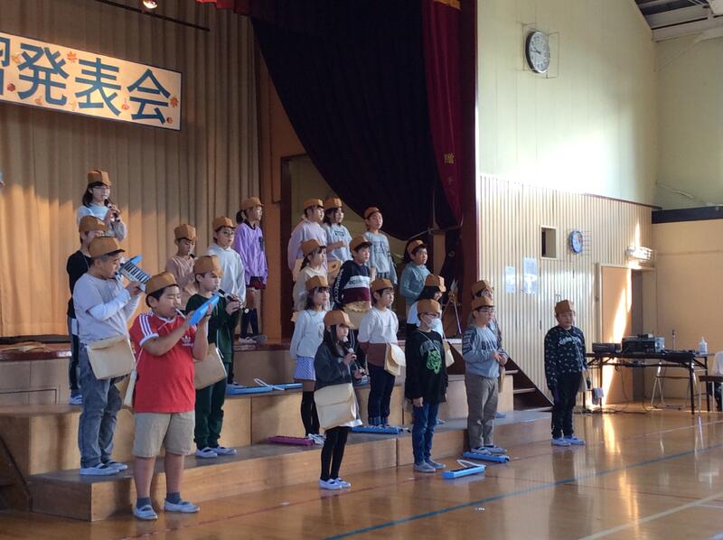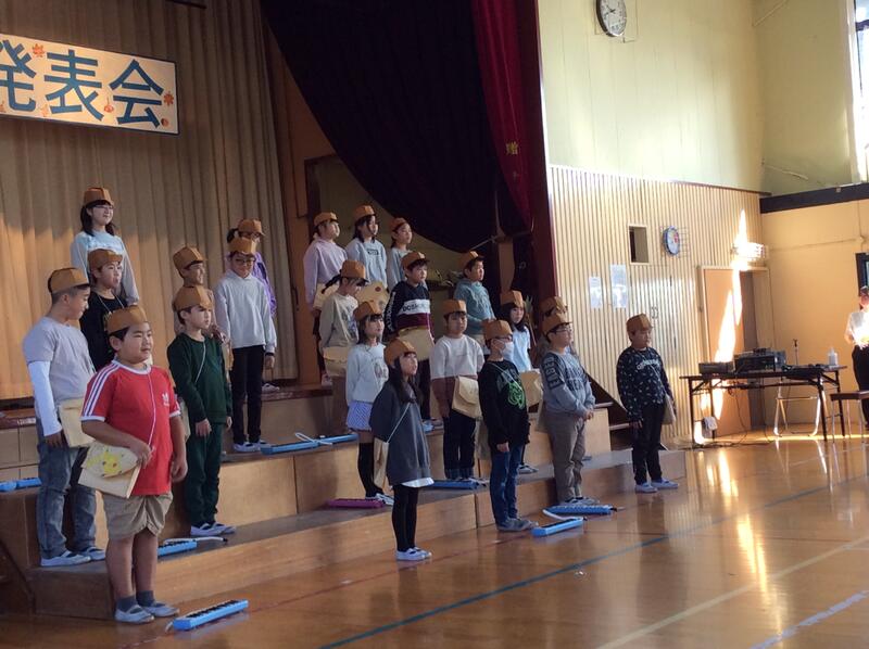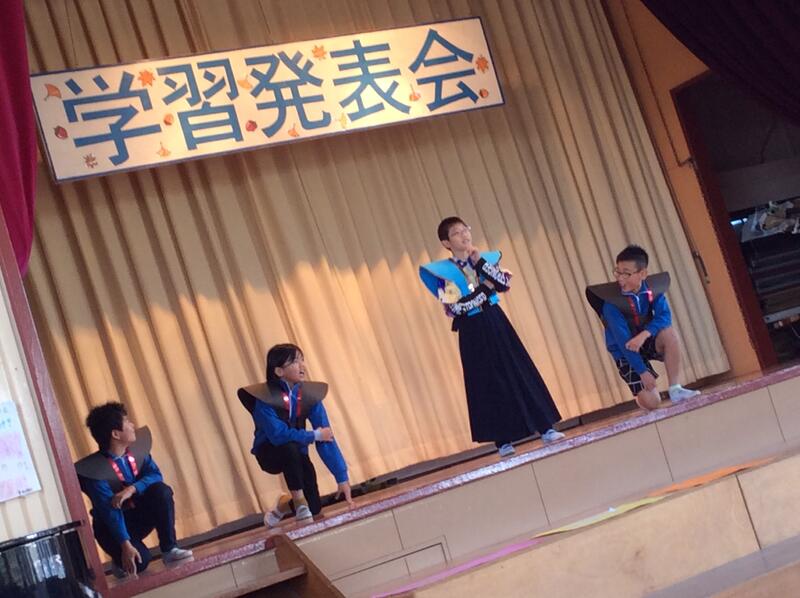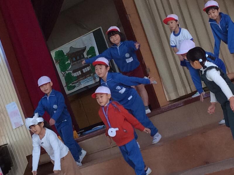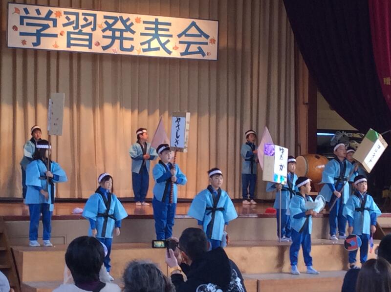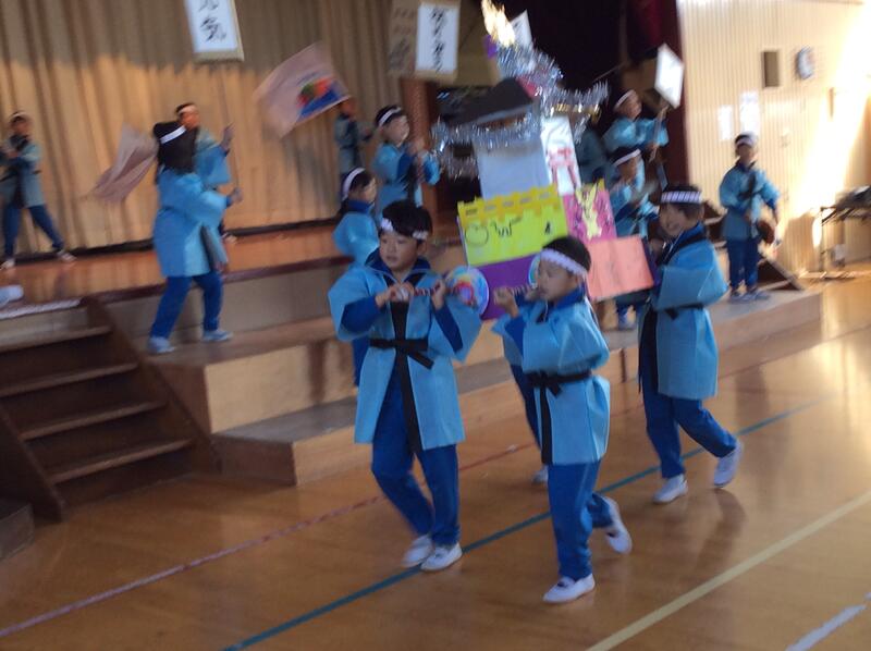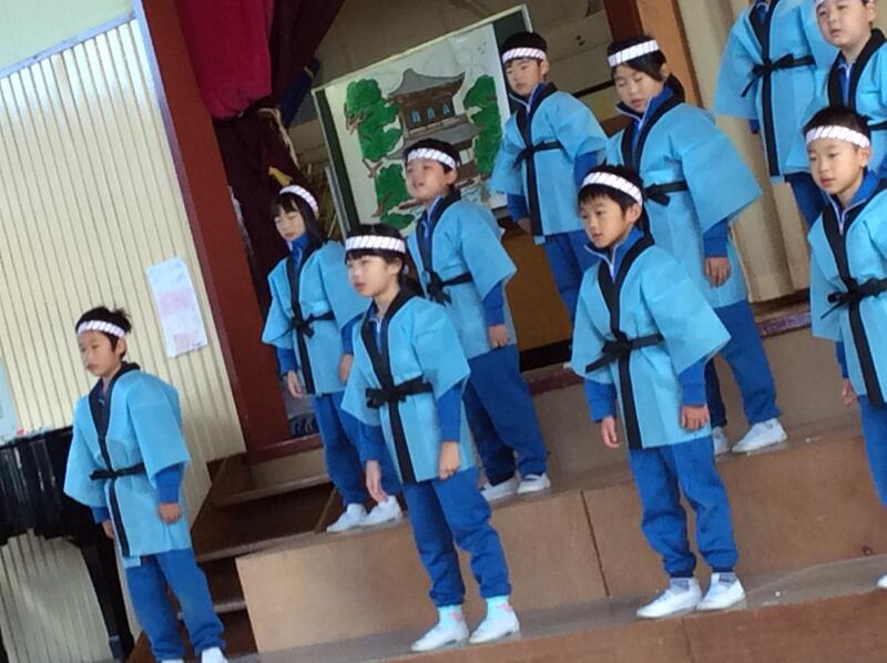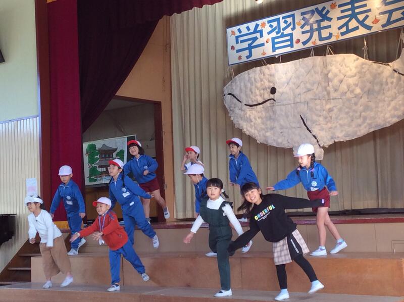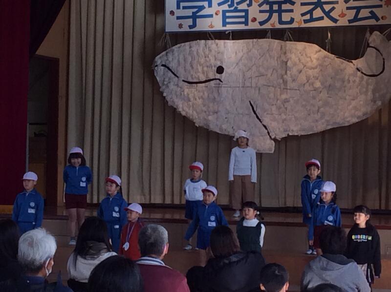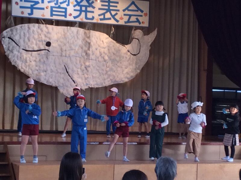 本日、八幡小学校の学習発表会が行われました。1年生は、国語劇「くじらぐも」です。国語の教科書にのっている「くじらぐも」の音読劇です。その中にダンスあり、合奏あり、歌もあり、とてもかわいらしい発表でした。