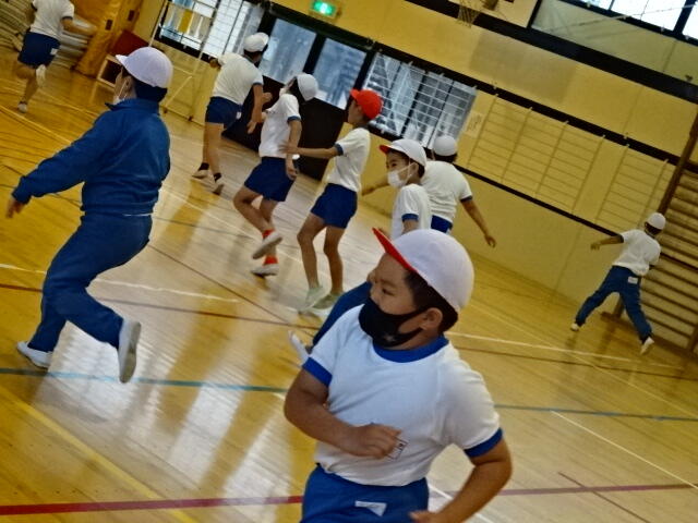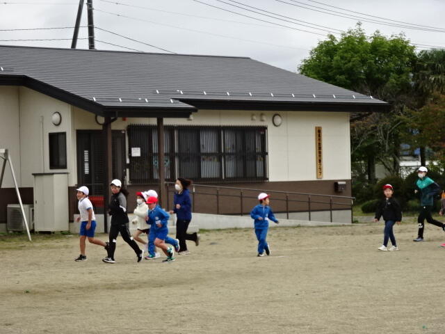 音楽に合わせて、約3分間、自分のペースで走るように声をかけています。この積み重ねが、マラソン記録会でのねばり強い走りにつながります。