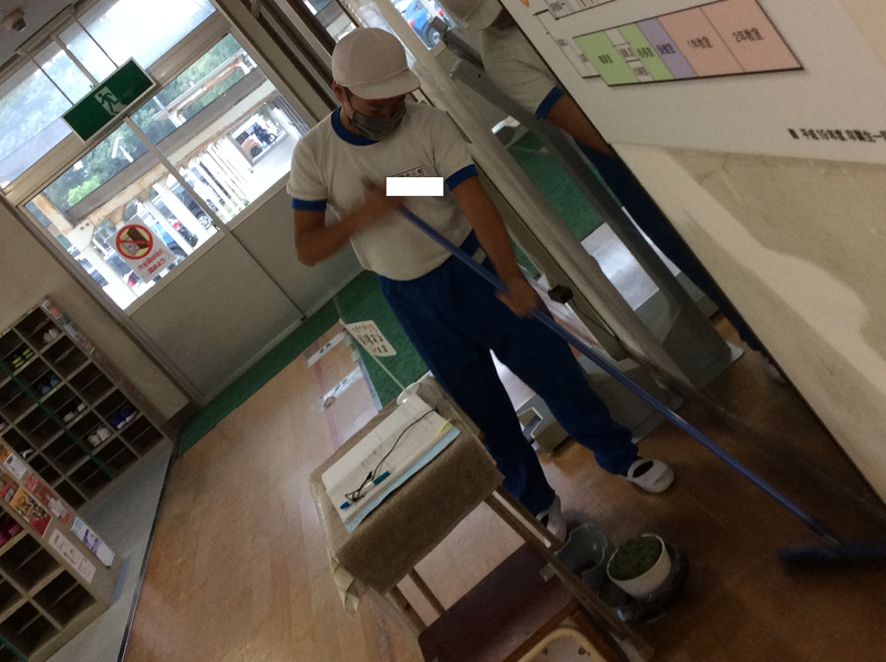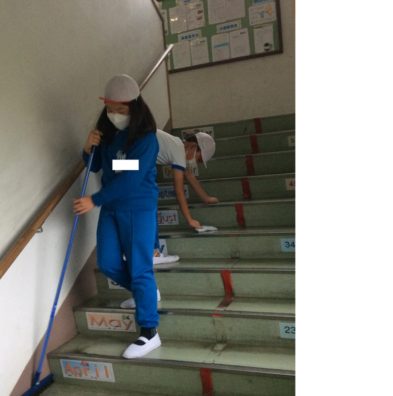 階段清掃では、ほうきですみずみまではいた後に、ぞうきんをかけるというチームワークできれいにしてくれています。