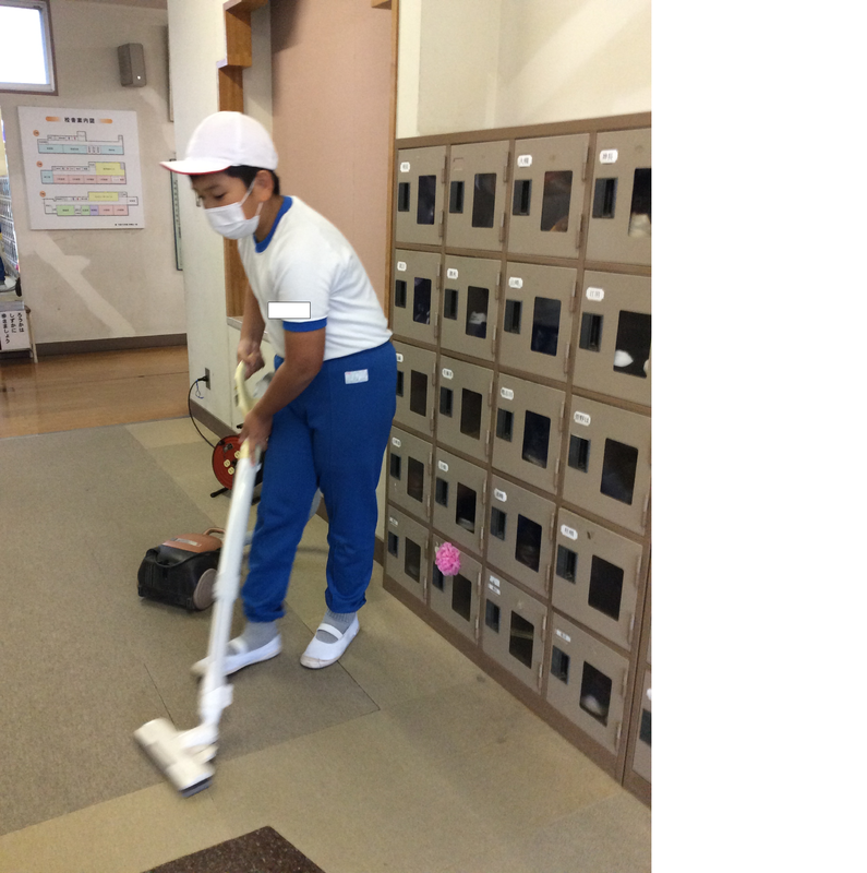 今日の一斉清掃の様子です。各掃除場所に分かれて、6年生の班長を中心に清掃をしています。昇降口を担当する班は、玄関に置いてあるものをずらしてほうきではいたり、じゅうたんの部分を掃除機できれいにしてくれたりしています。