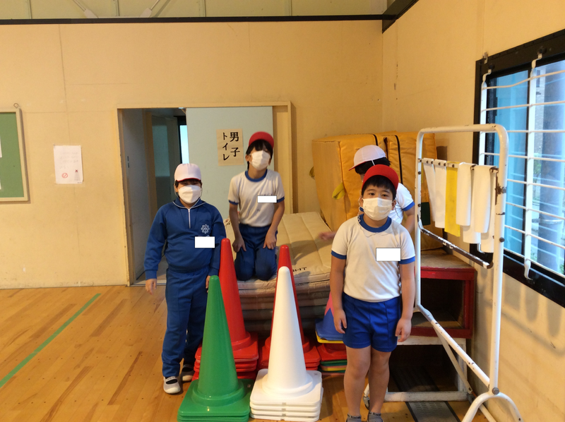 体育館清掃では、モップがけとトイレ清掃の他に、コーンをきれいにそろえることもしました。色別にきれいにそろえられていて、気持ちがいいですね。