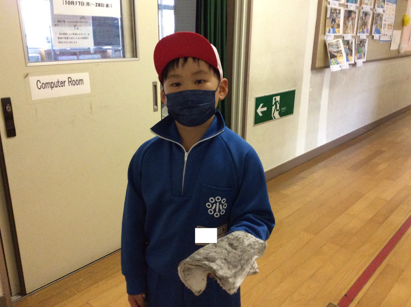 清掃を終えた1年生のぞうきんを見せてもらいました。床のほこりがたくさんついています。それだけがんばって床ぶきしたことがわかります。