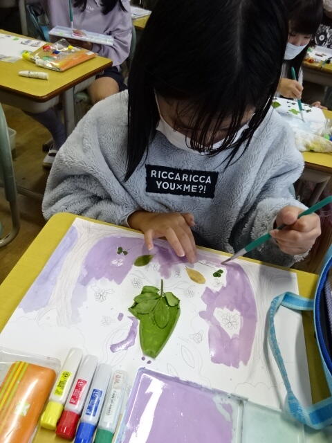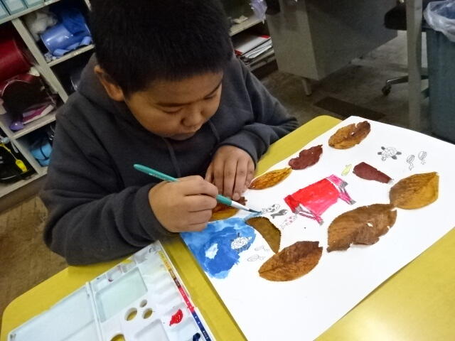 校庭から集めてきた葉を使って、自然の色を表現します。