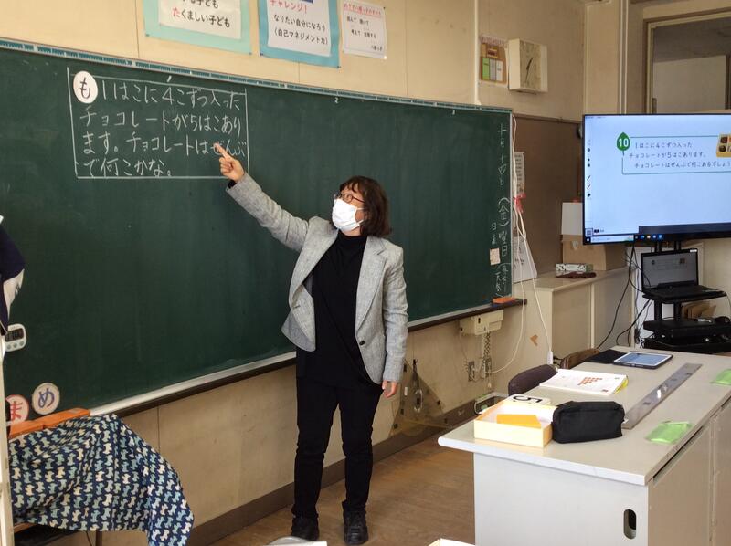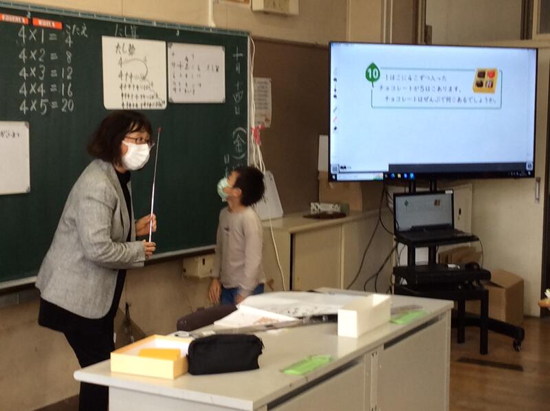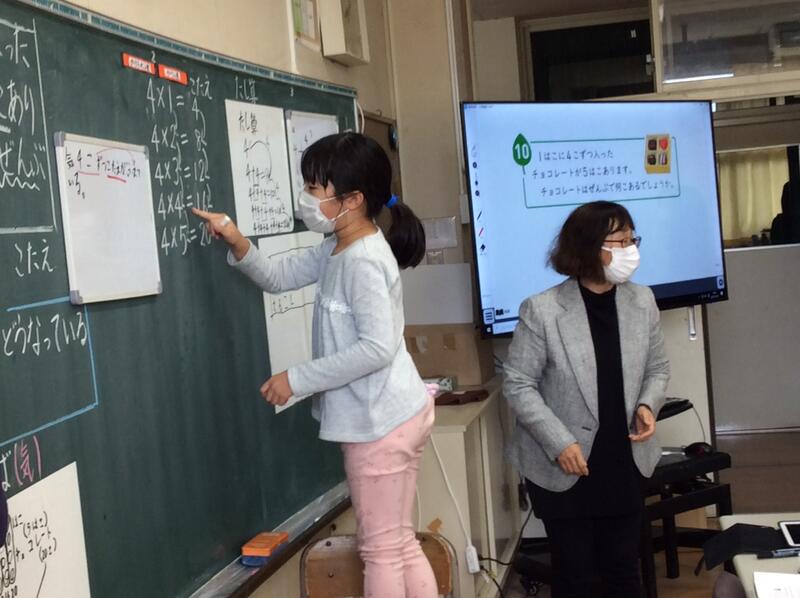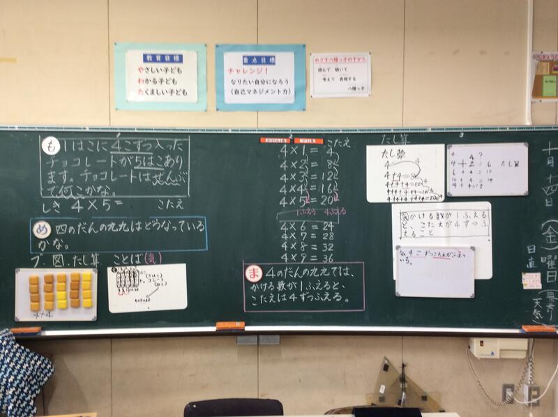10月14日(金)の5校時目に、2年生の算数科の研究授業がありました。授業のめあては、「4のだんの九九は、どうなっているかな」です。4の段の九九がどうなっているかをブロックや図、たし算などを使って考える学習です。