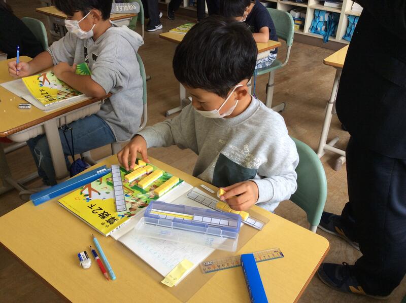 ブロックを使って考えたり、図をかいて考えたりと、子どもたちは、それぞれ調べる方法を決めて考えました。
