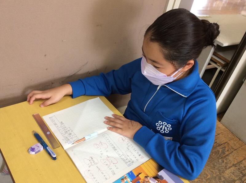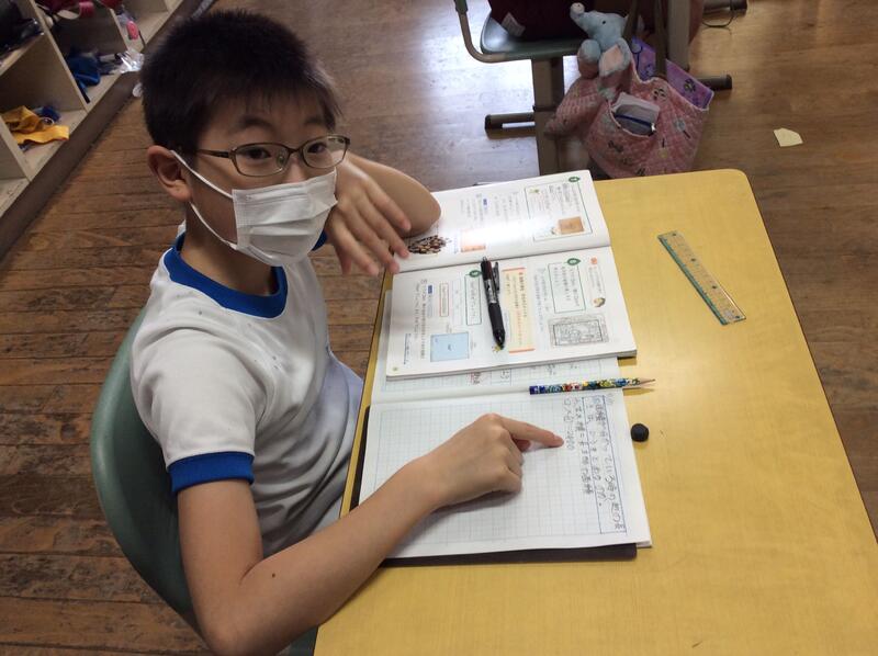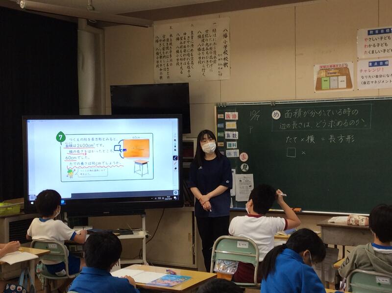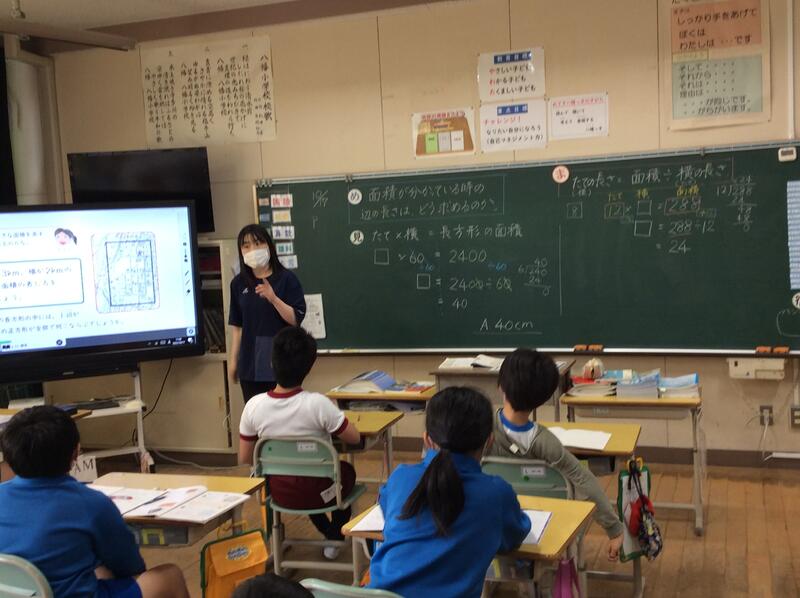 4年生の算数の授業の様子です。4年生では、現在「面積」の学習をしています。今日は、長方形の面積と横の長さが分かっている時のたての長さはどう求めるのかを考えました。