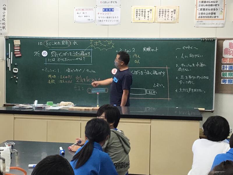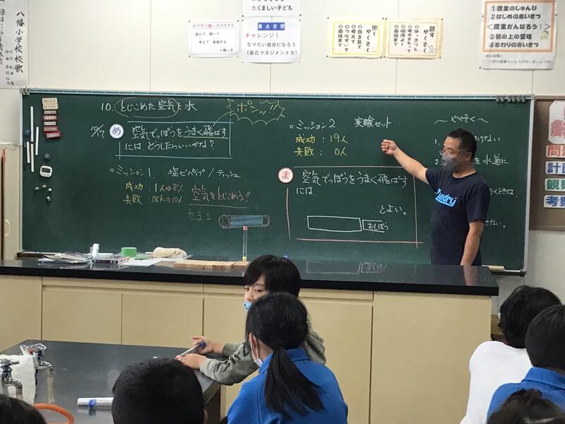 こちらは、なかなかうまく飛びません。先生からの言葉。「黒板に書いてある言葉がヒントです。」「あ、とじこめた空気って書いてある。」ここで子どもたちは、空気をとじこめなければ、うまく飛ばないことを学びました。