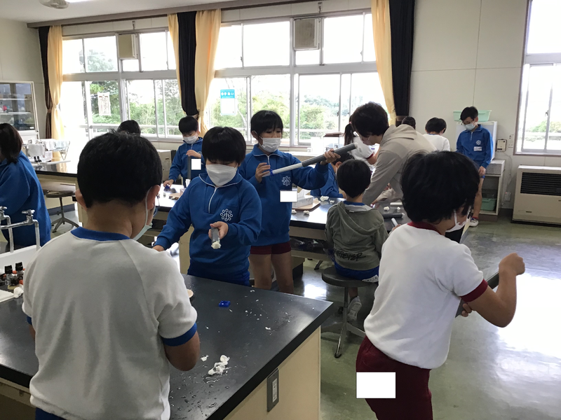 4年生の理科の学習です。「とじこめられた空気と水」の学習です。今日のめあては、「空気でっぽうをうまく飛ばすには、どうしたらいいかな」です。まず塩ビパイプとティッシュを使って、うまく飛ばせるかを試しました。