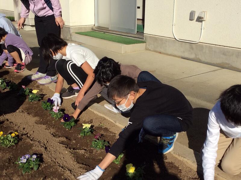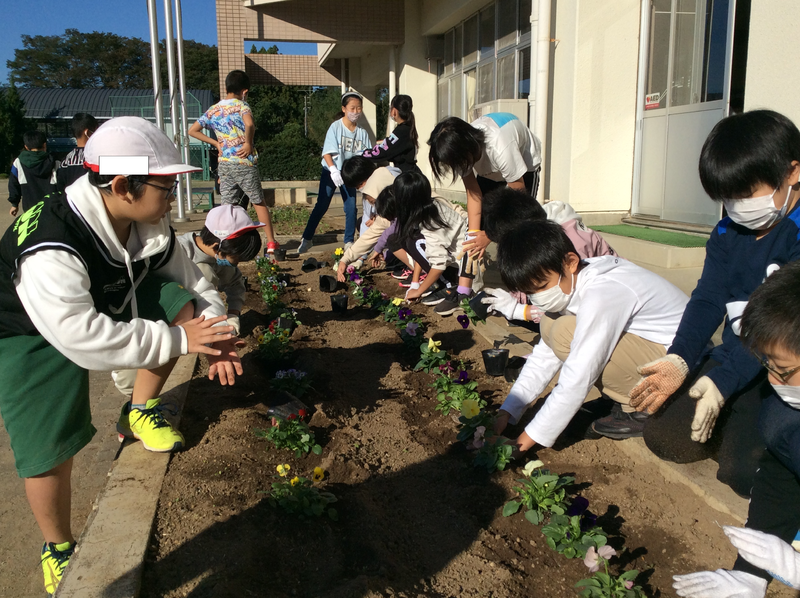 10月19日(水)に、4年生が花壇の花植えをしました。パンジーやビオラなどの花を一人一鉢ずつていねいに植えていました。