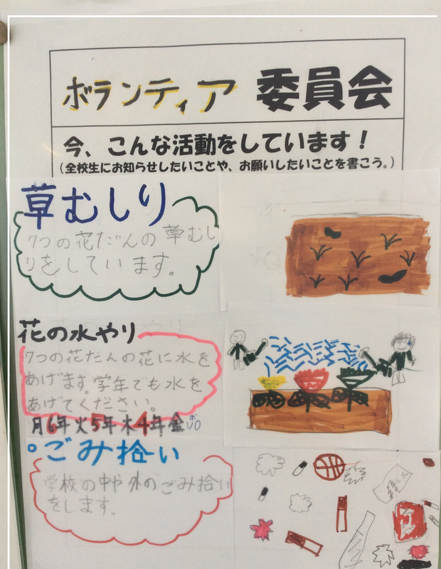 ボランティア委員会では、花壇の水やりを学年で分担してしたり、校舎内をモップがけして清掃したりと、みんなが気持ちよく生活できるように、活動しています。