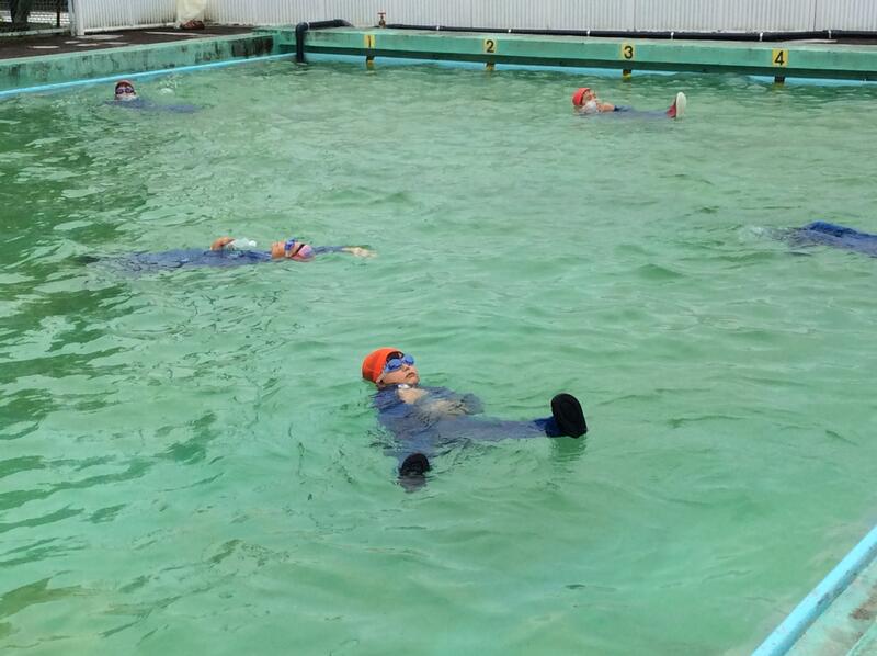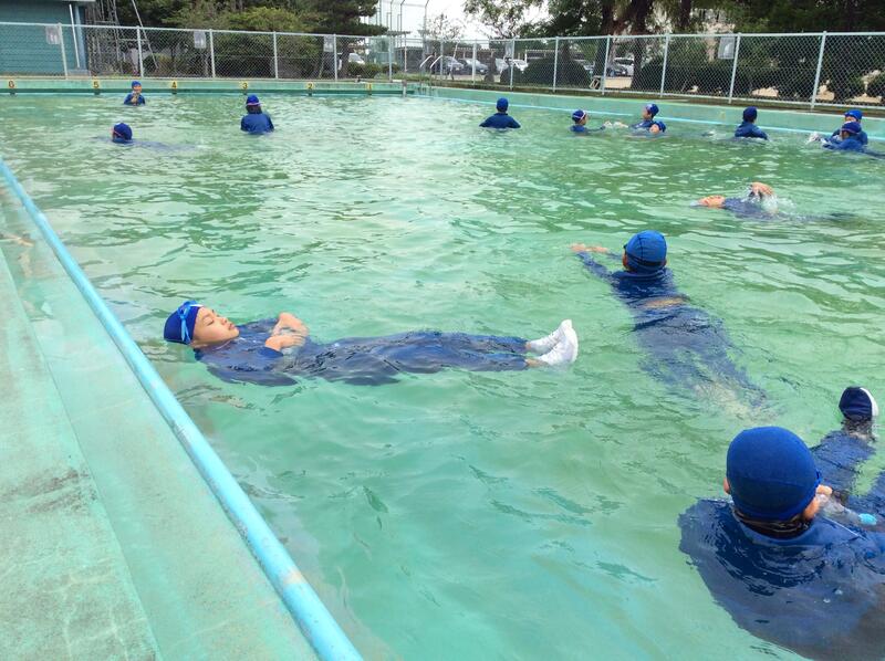そして、5年生です。5年生は、運動着を着たまま泳ぐことで、泳ぎづらいことを学びました。次にペットボトルを使って長い時間浮く練習をしました。