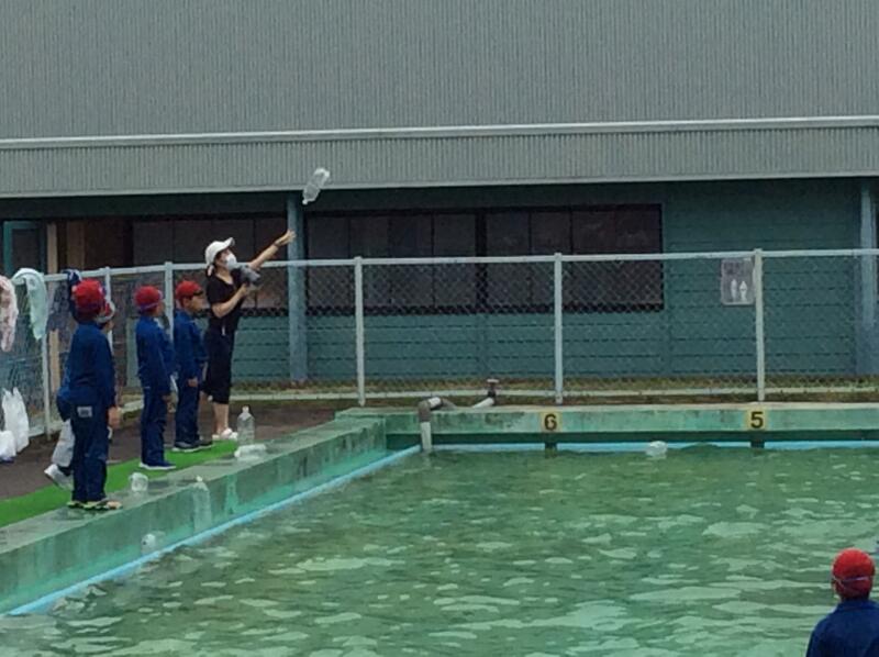 次は、3年生です。先生が、まず空のペットボトルを、次に少し水を入れたペットボトルをプールに投げ入れました。そのことから、子どもたちは、少し水の入ったペットボトルの方が、相手がいる場所に届きやすいことを学びました。その後、実際に子どもたちもやってみました。