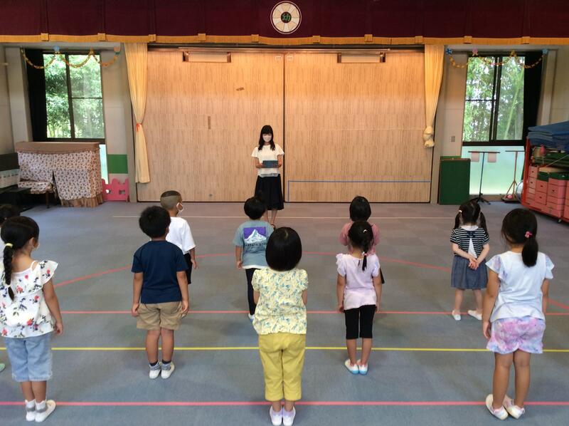 2022年7月21日 08時41分7月20日(水)、第1学期の終業式を遊戯室で行いました。背筋をぴんとの伸ばし、よい姿勢で話を聞く姿に、大きな成長を感じます。園長からは、「おうちの方とたくさんお話をすること。手伝いをがんばること。けがをせず、2学期に元気に登園すること」のお話がありました。全園児の「1学期楽しかったこと」の発表もとても立派でした。養護教諭からは、夏休みに守ってほしい「は・か・せ」についての話がありました。「は・か・せ」とは何か、ぜひ、お子様に聞いてみてください。しっかり話を聞いていたので、きっとわかると思いますよ。