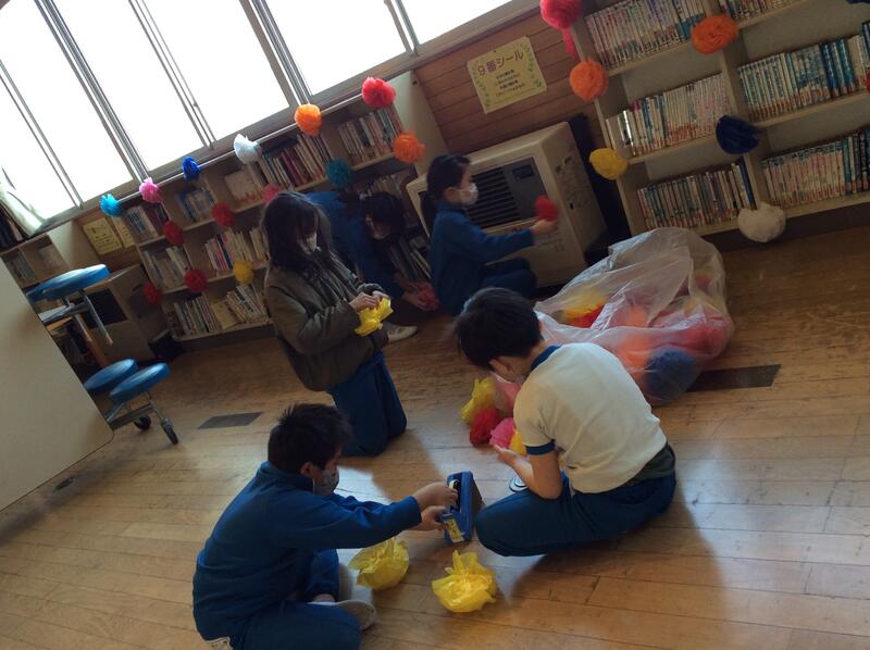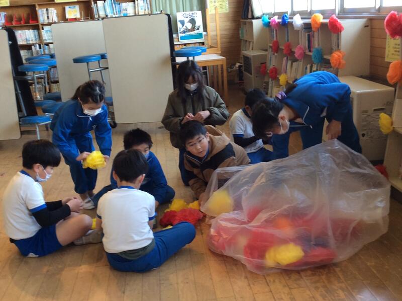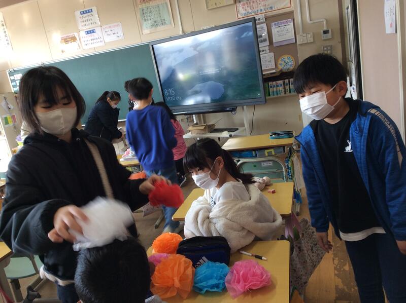 6年生のことを思ってみんなで作った飾り。この飾りで、会場はぱっと華やかになりました。明日の6年生を送る会では、6年生に今までのたくさんの「ありがとう」を伝える会にしたいですね。