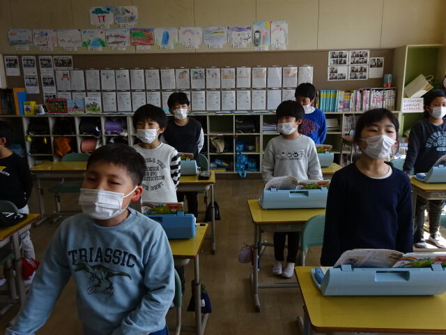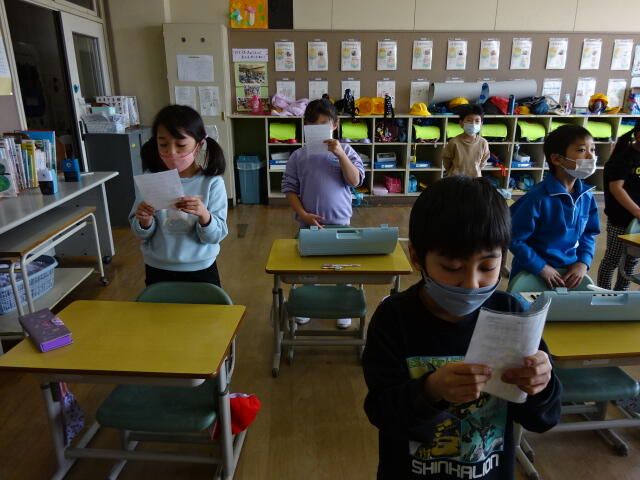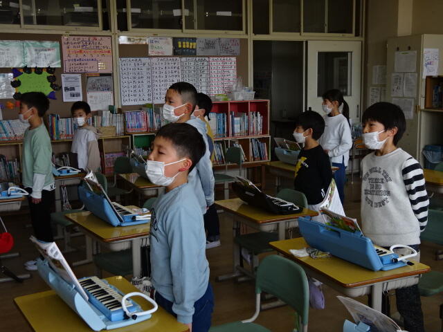 2023年3月10日 14時58分卒業式に向けて、低学年の子どもたちが教室で歌の練習をしていました。