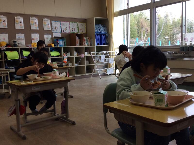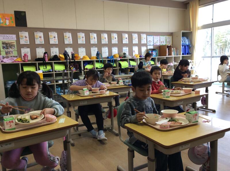 3月13日(月)の給食は、卒業を祝う献立でした。紫黒米入りごはん、牛乳、鮭の塩焼き、沢煮椀、お祝い紅白ゼリーです。1年生も、味わいながら食べていました。