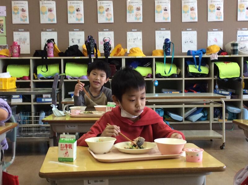 2023年3月13日 17時29分3月13日(月)の給食は、卒業を祝う献立でした。紫黒米入りごはん、牛乳、鮭の塩焼き、沢煮椀、お祝い紅白ゼリーです。1年生も、味わいながら食べていました。