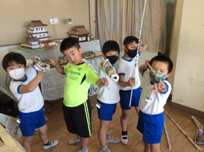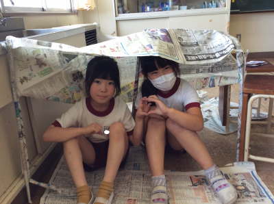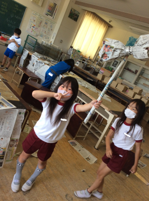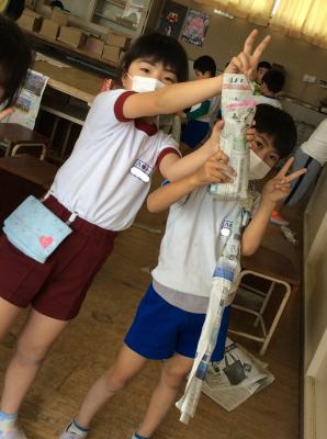 授業が終わる頃には、新聞紙の家やテント、剣などそれぞれの表現力が光る作品がたくさん並んでいました。