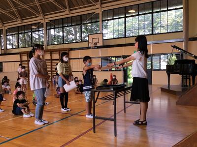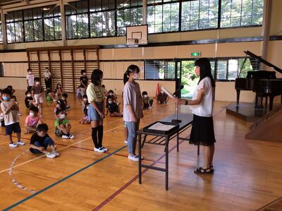 たなばた展表彰 2021年7月20日 13時23分 始業式終了後、たなばた展の表彰がありました。代表児童は立派な態度で賞状をうけとっていました。本校からは特選、金賞、銀賞を含めて多くの児童が入選しました。また、そのことが評価され学校賞もいただくことができました。
